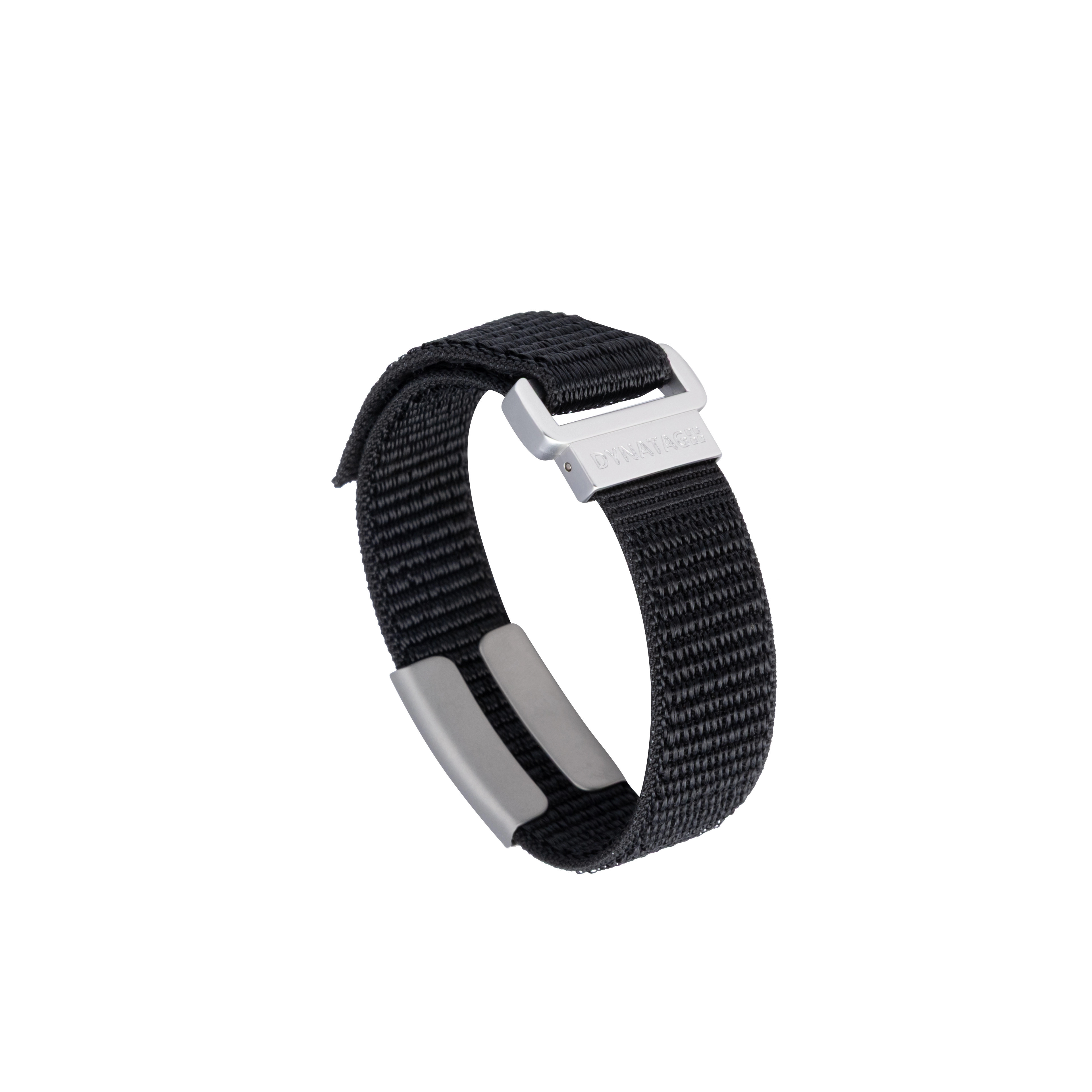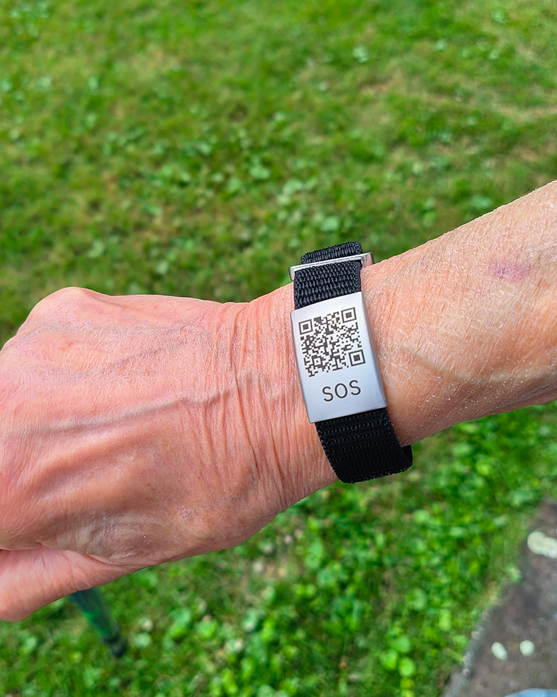The modern black information wristband with a textile band and flexible hook-and-loop fastening is highly durable and allows for clear access to stored information via the integrated QR code.