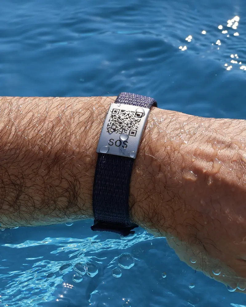 The stylish purple information wristband with a textile strap and adjustable hook-and-loop fastening is well suited for individual styles and everyday use. Stored information can be accessed clearly and in a structured manner via the integrated QR code.