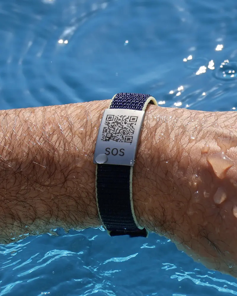 The stylish information wristband with a blue textile strap, yellow accent color (edge), and adjustable hook-and-loop fastening is designed for everyday use. Stored information can be accessed clearly and in a structured manner via the integrated QR code.