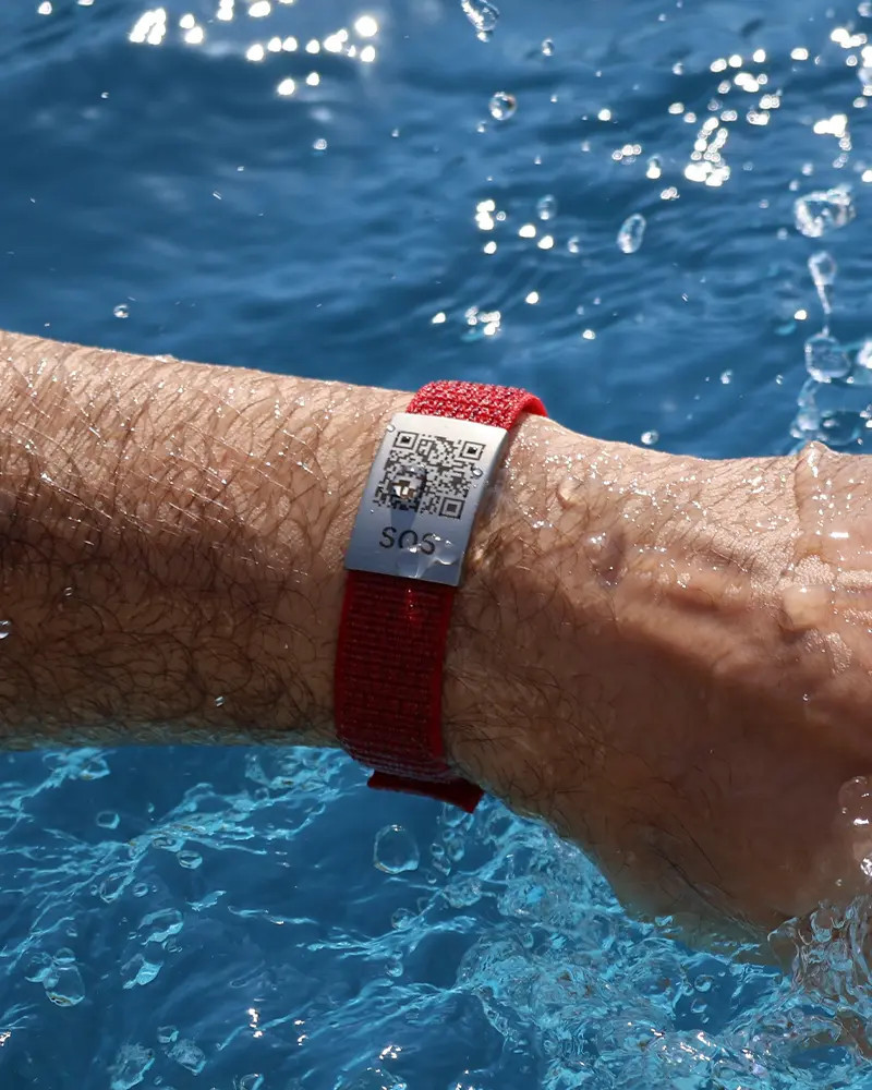 Distinctive in color: the modern, bright red information wristband features a textile strap with an adjustable hook-and-loop fastening and is designed for everyday use. Stored information can be accessed clearly and in a structured manner via the integrated QR code.